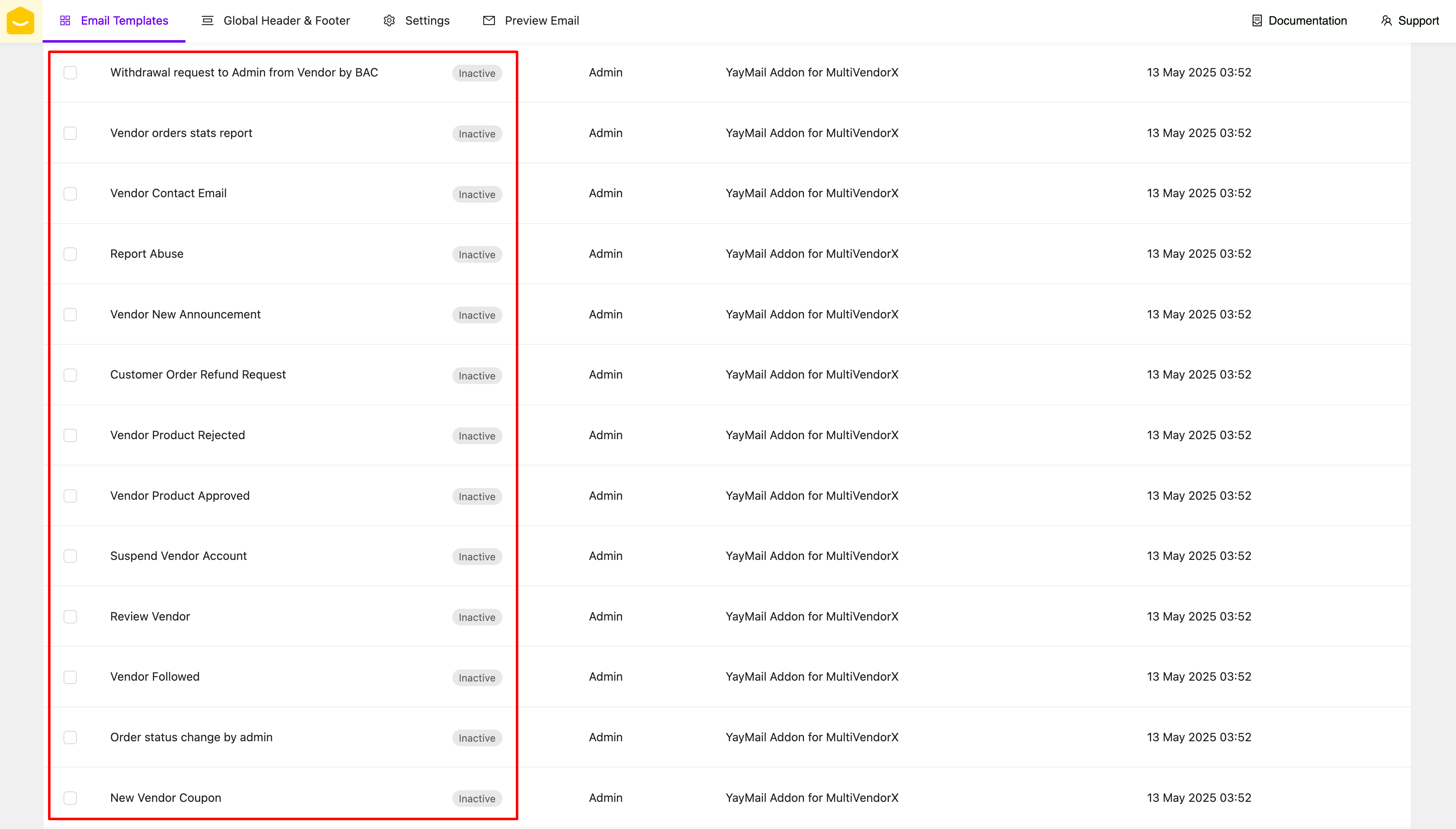[**YayMail Addon for MultiVendorX**](https://yaycommerce.com/downloads/yaymail-addon-for-wc-marketplace/) allows you to customize templates generated by MultiVendorX in YayMail interface.