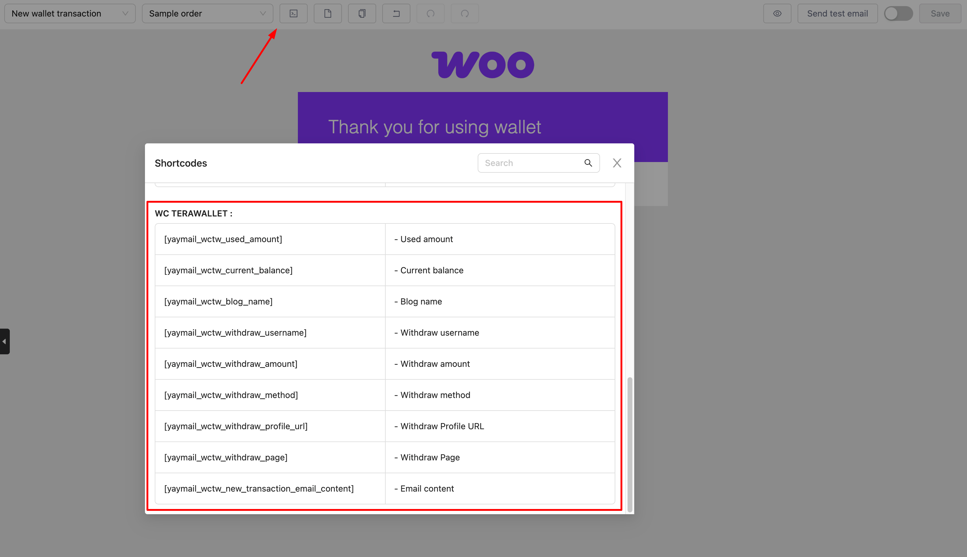 TeraWallet for WooCommerce shortcodes are listed in the Shortcode section. Depending on the template you're editing, this section will display only the shortcodes that are available and compatible with that specific template.