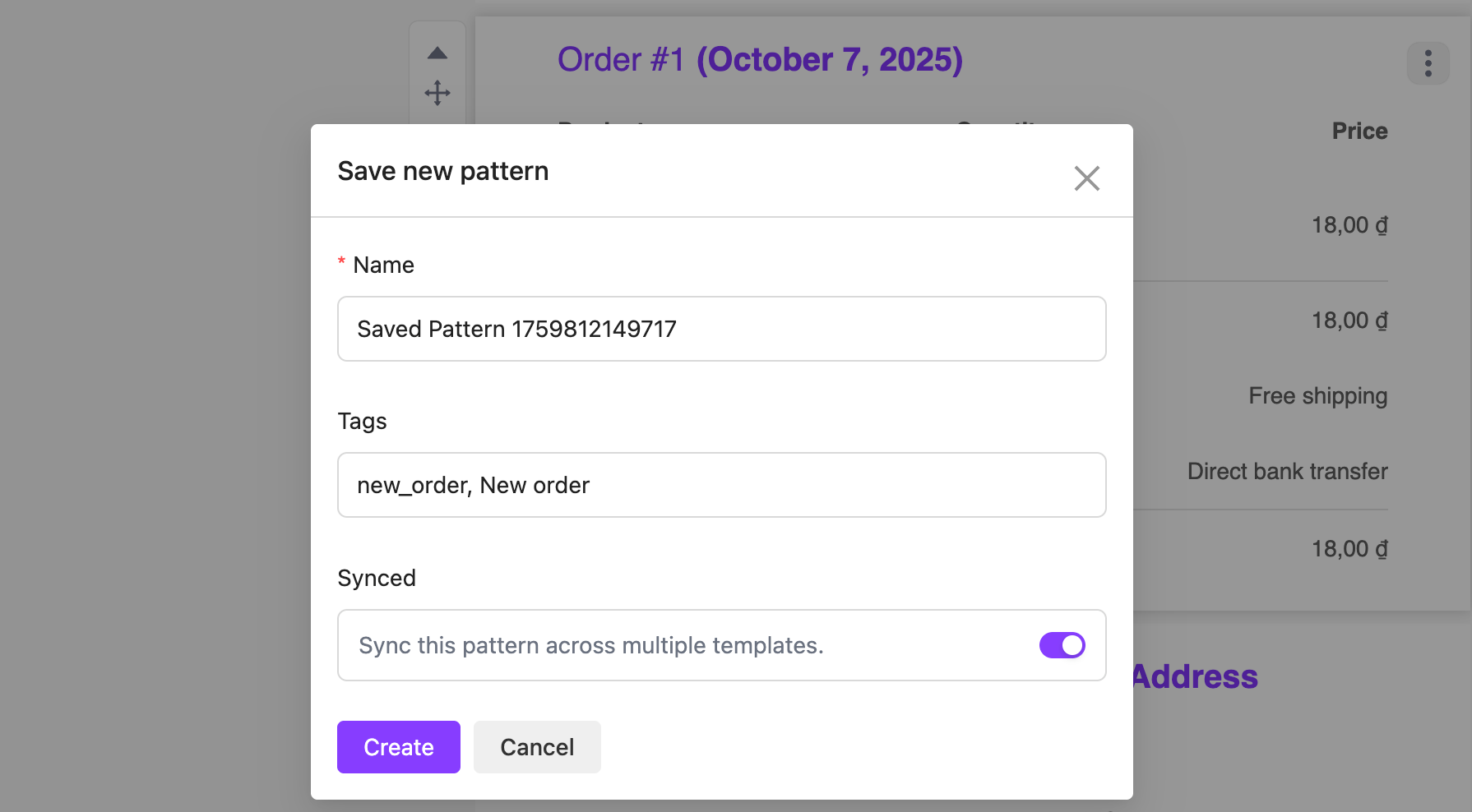 The **Create Pattern** feature allows you to save a specific design block or section as a reusable pattern. This helps you quickly apply the same layout or styling across different email templates without rebuilding from scratch.