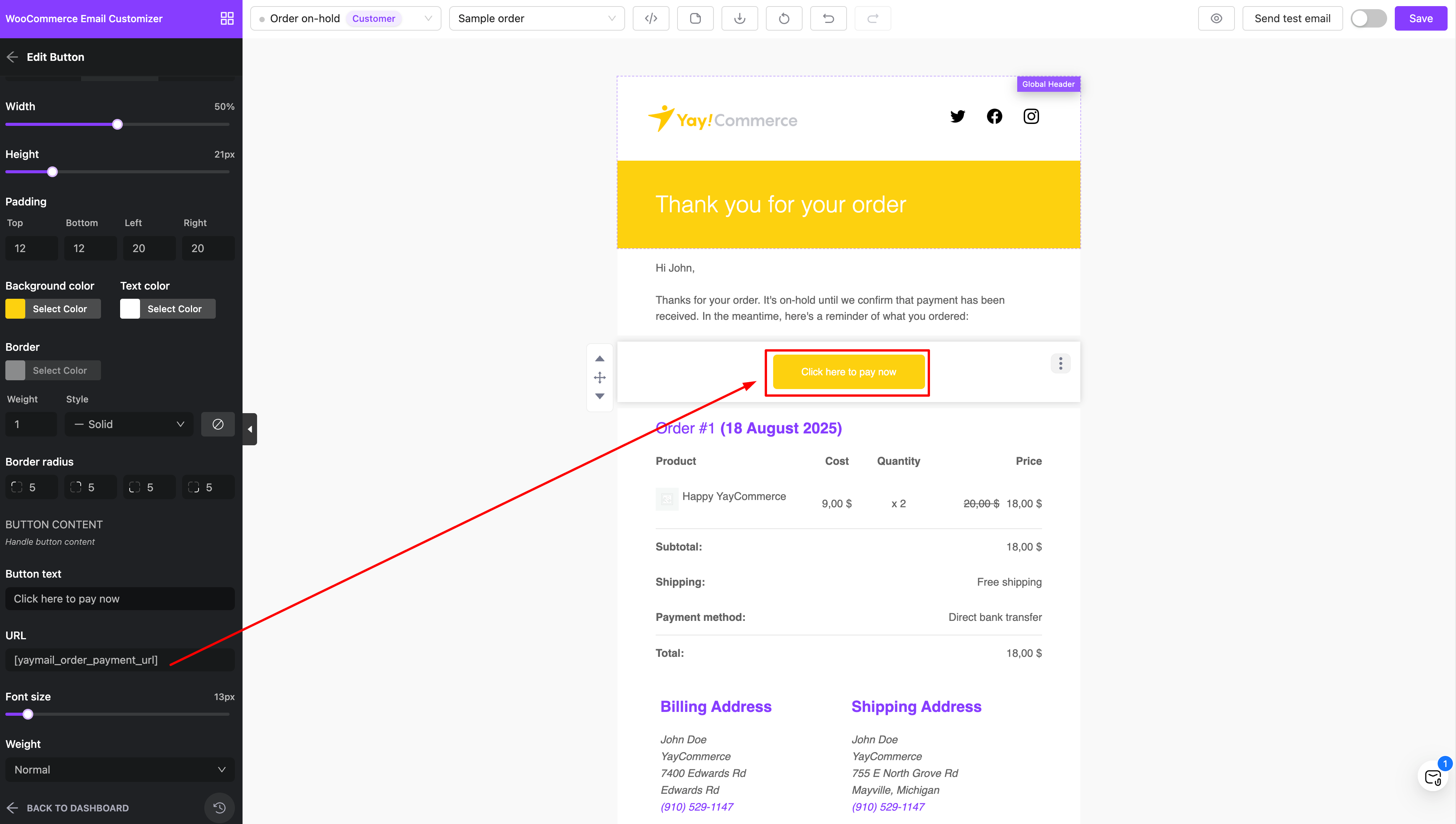 You can embed a YayMail shortcode into a button by adding the shortcode into the URL field.