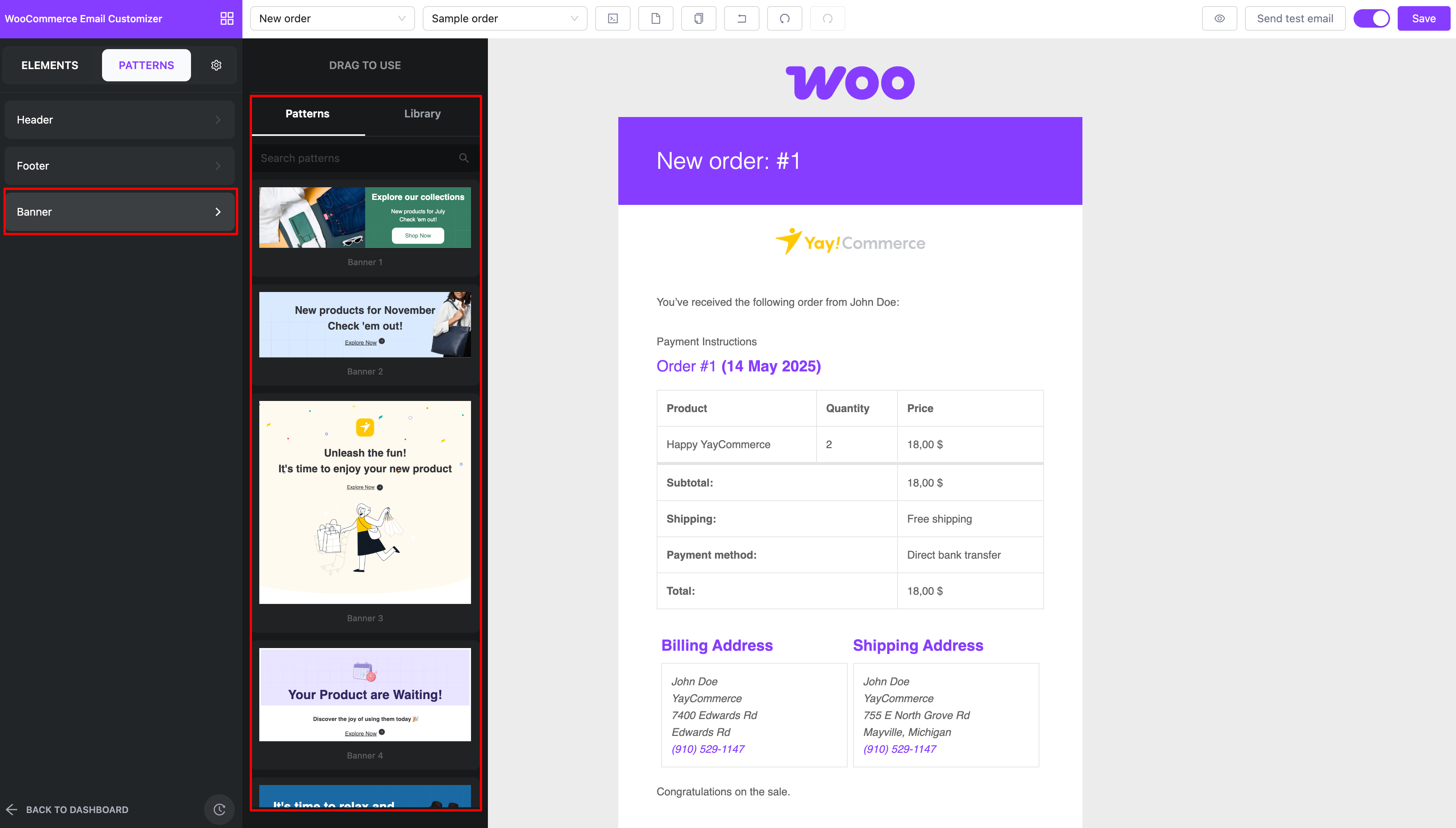 The **Banner** section in YayMail allows you to instantly capture the reader’s attention and highlight key messages in your email. With a variety of pre-designed templates—such as promotional banners, new product announcements, or welcoming visuals—banners not only enhance the visual appeal of your emails but also help communicate important content effectively. You can easily drag and drop these elements into your email layout and customize images, text, and call-to-action buttons to match your campaign’s goals.