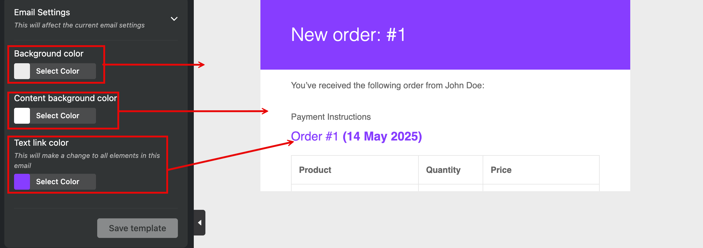 * **Text Link Colour:** This option allows you to choose colour for texts that are hyperlinked in the Email template.