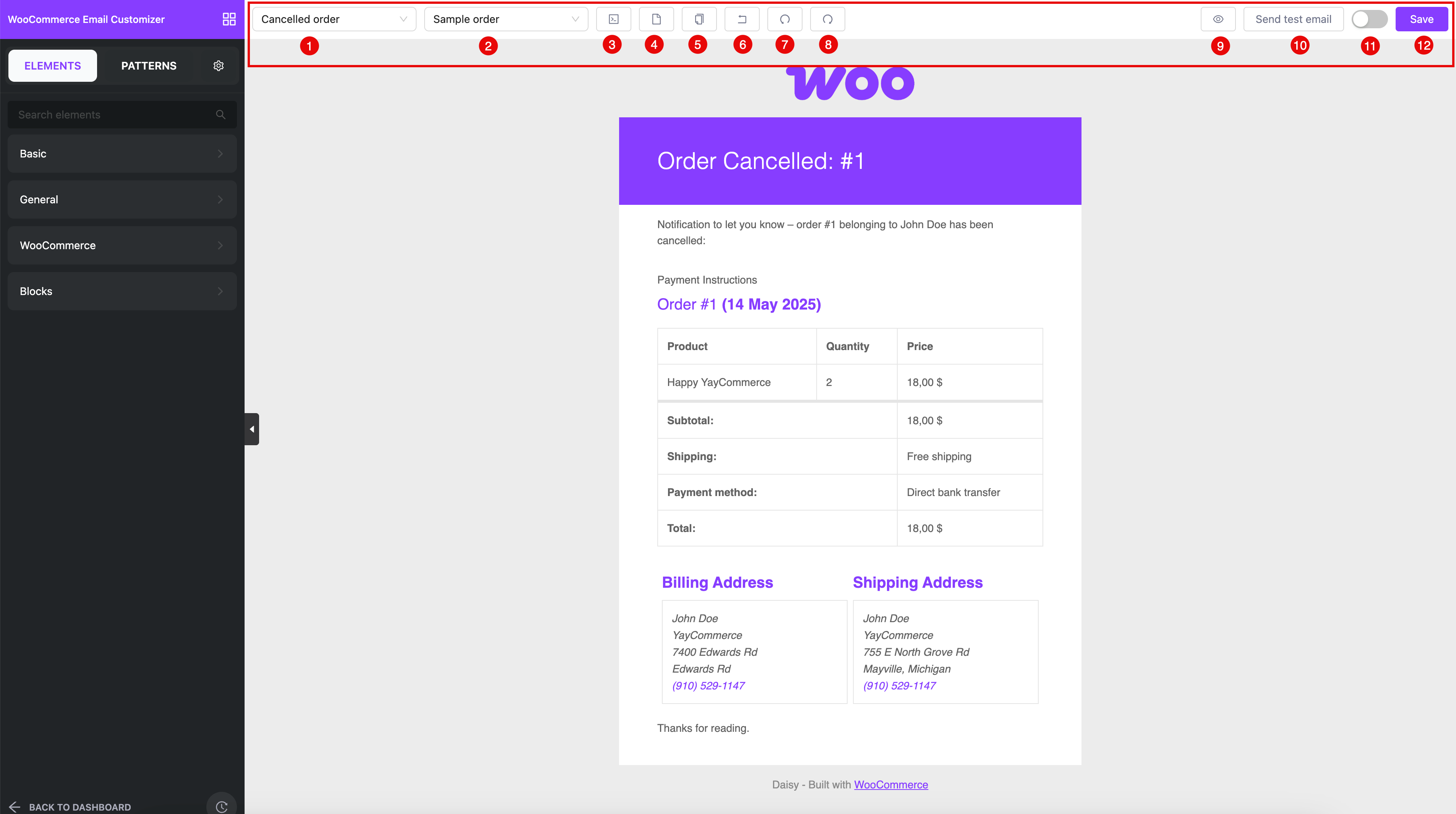 Email to show: This is the dropdown that contains all the different WooCommerce Email templates to select and show in the editor screen.