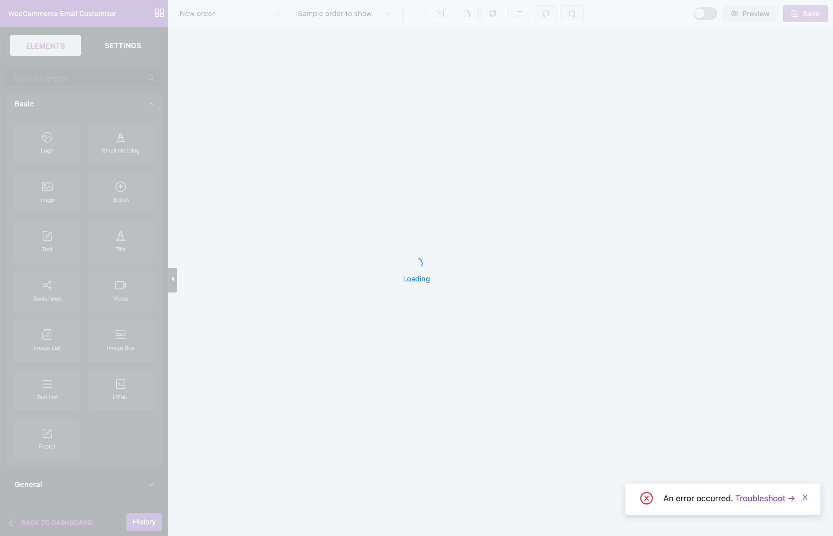 If you visit the WooCommerce Email Customizer and face "An error occurred" notice showing up on the bottom-right of the screen, here's how to troubleshoot it.
