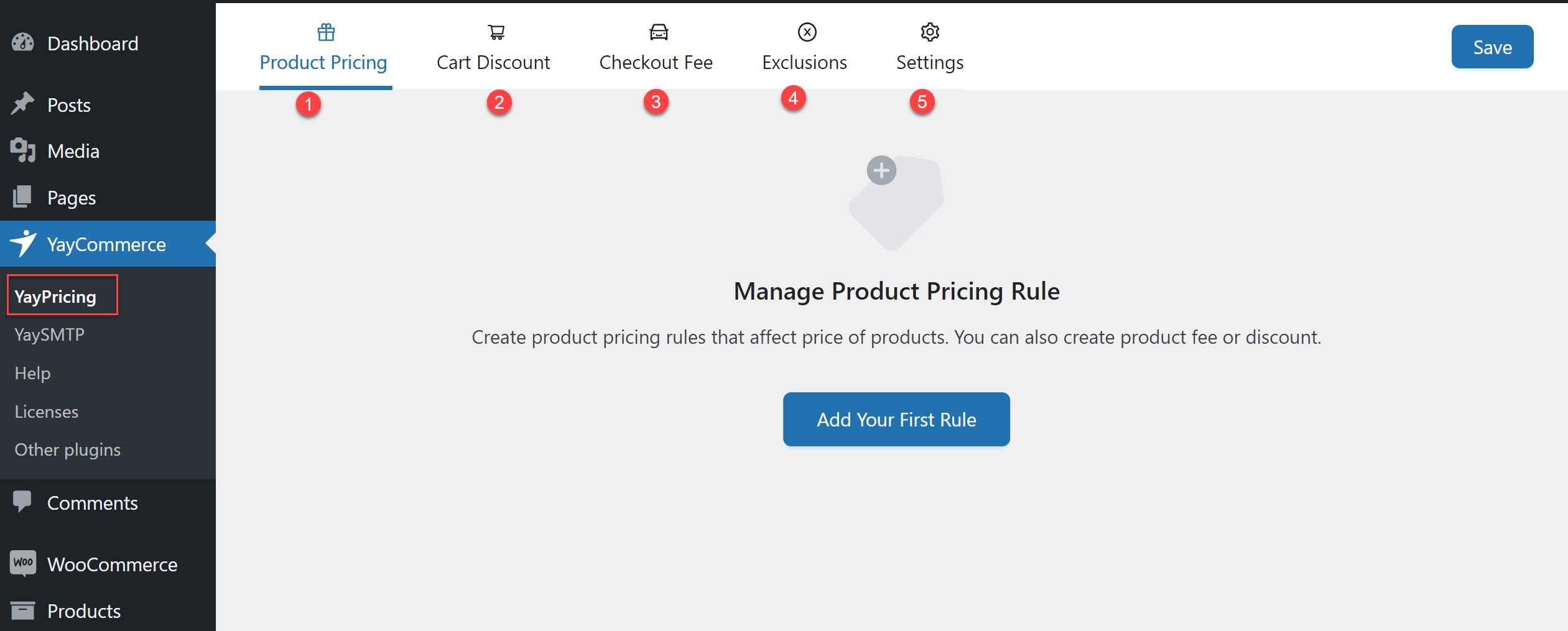 Once YayPricing is installed successfully, navigate to YayCommerce > YayPricing. This is where you would get tabs that will allow you to create rules or see all your existing rules, as well as check all the rules you've created before.