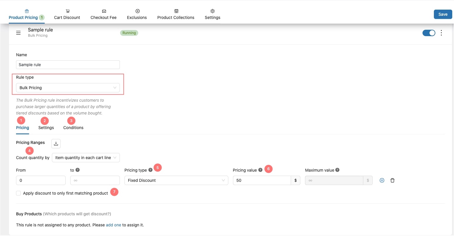 1. This sub-tab allows you to set the rule methods for the Bulk Pricing Rule.