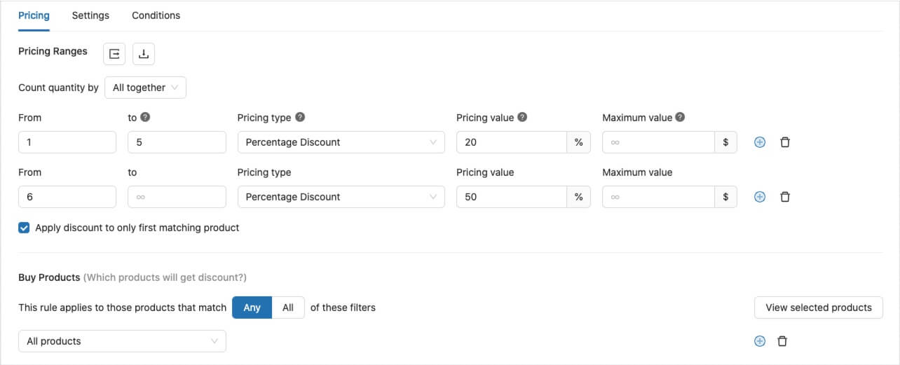 Example 1: Buy 1 to 5 units for a 20% discount, and 6 or more units for a 50% discount. The rule applies only to the first matching product in the cart.