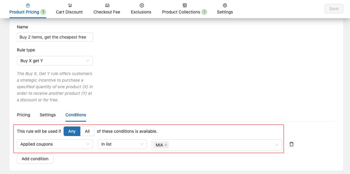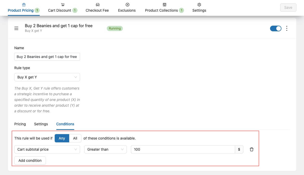 You can set conditions to further define when the rule should be applied and when it should not be applied to customers. In this example, we set the rule to apply only when the cart subtotal is greater than $100.
