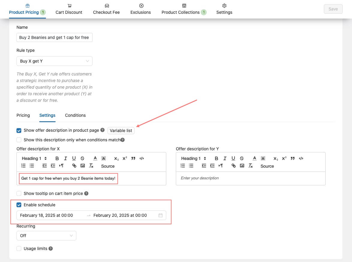 The screenshot below shows the settings that can be applied to our rule. There are up to 5 checkboxes that can be activated to apply the four available settings in this case. However, we have only checked boxes (1) and (4) to display the offer description on the product page and enable the promotion schedule.