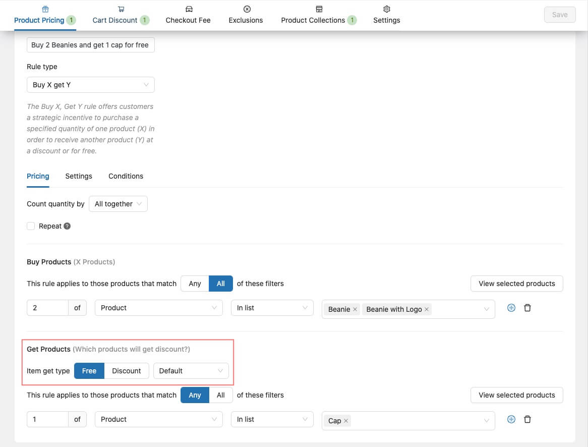 After selecting the Buy X Get Y rule, then we go ahead to configuring the price settings, as seen in the screenshot below;