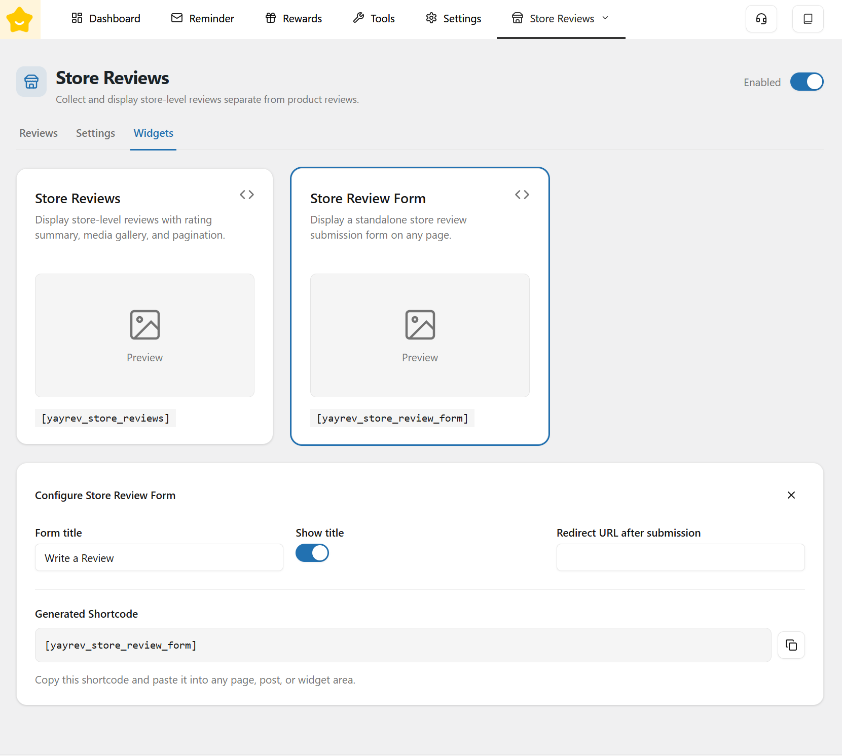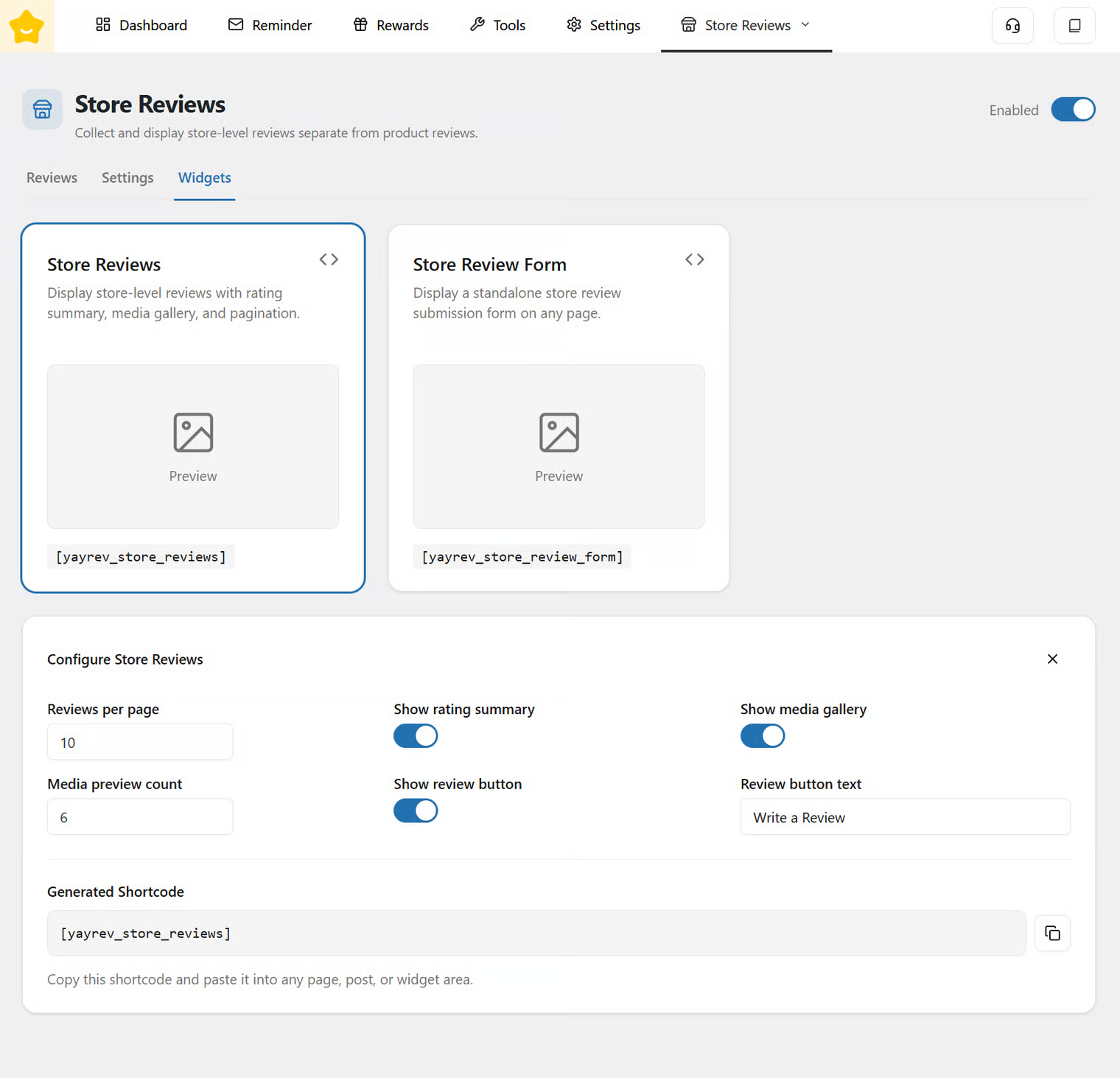 The **Widgets** section allows you to easily display store reviews and collect new feedback anywhere on your website using ready-made components.