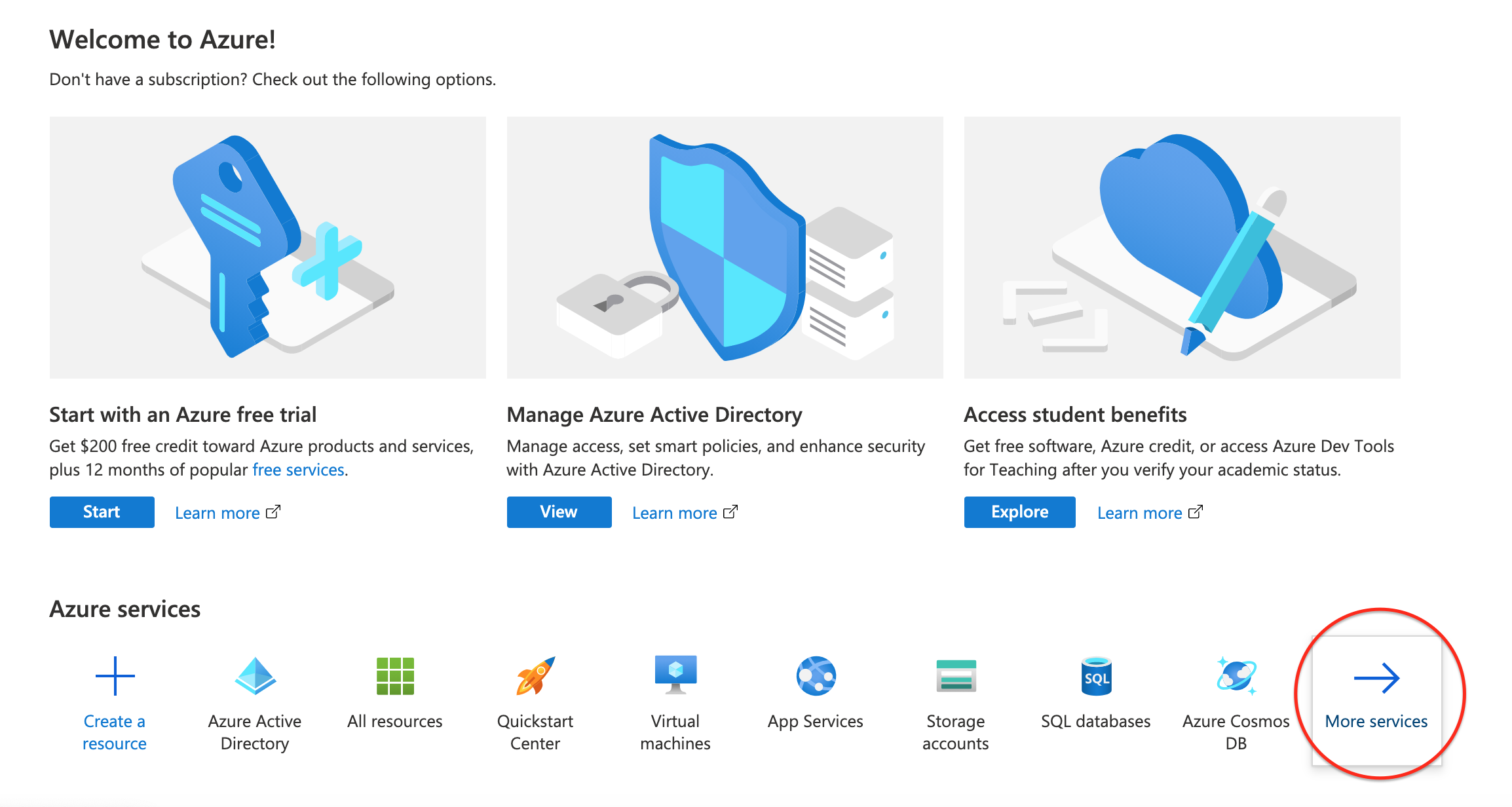 First, you visit Home - Microsoft Azure page, then you click "More services".
