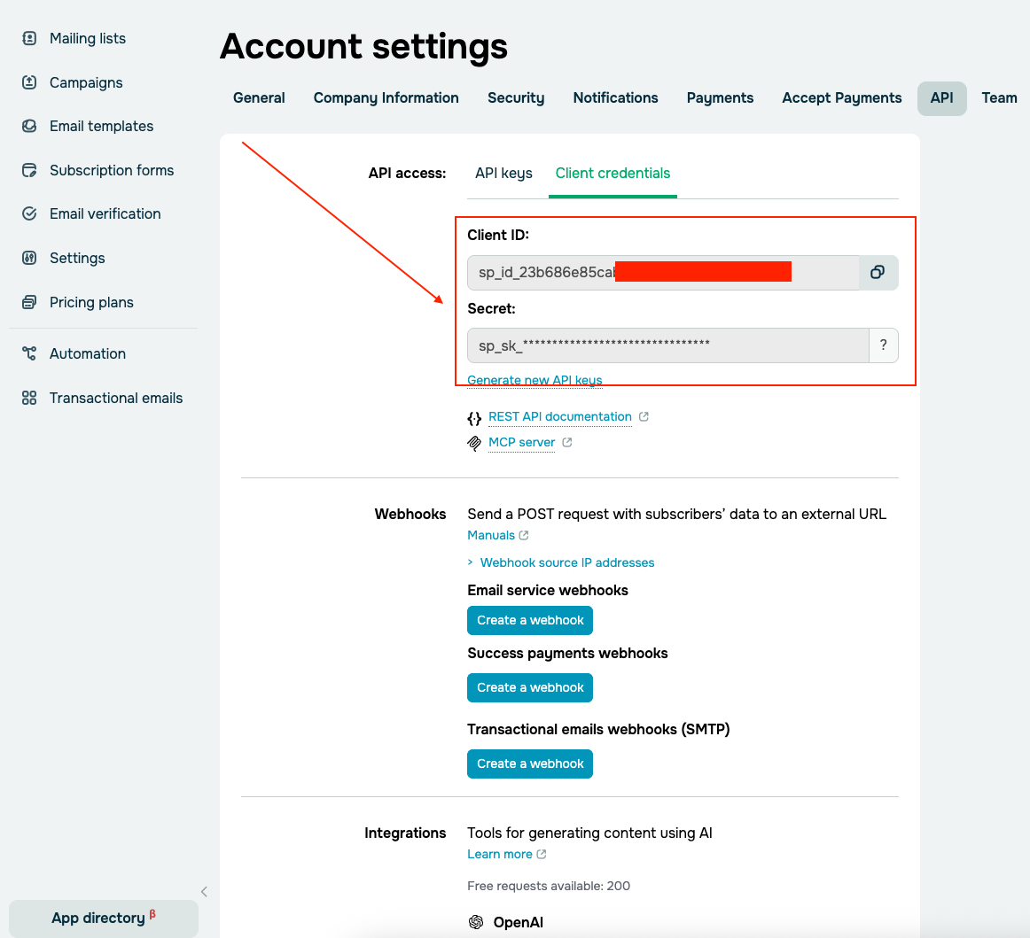 **2. Copy and integrate Sendpulse API ( ID & Secret ).**