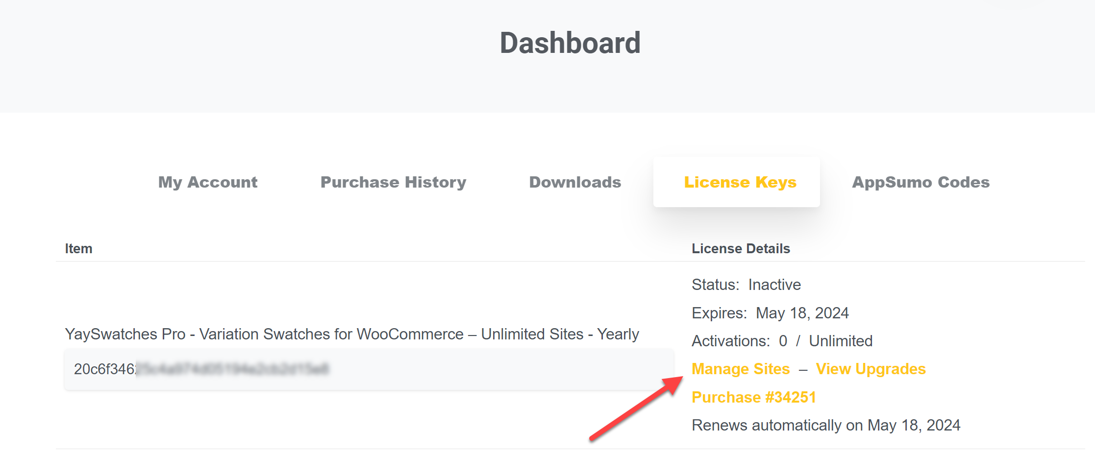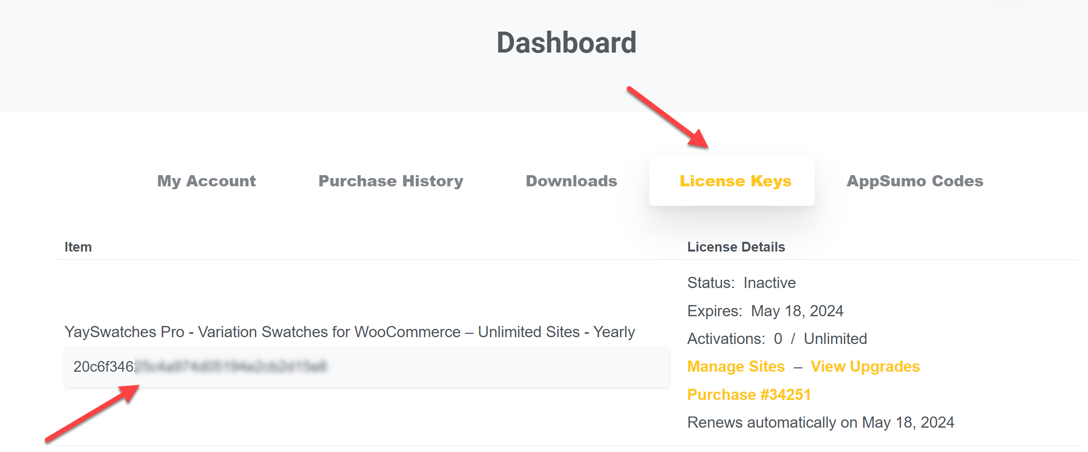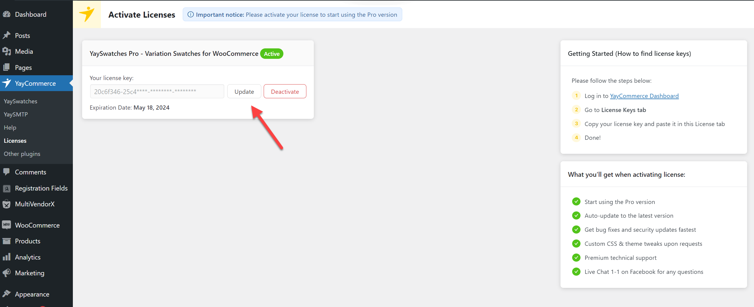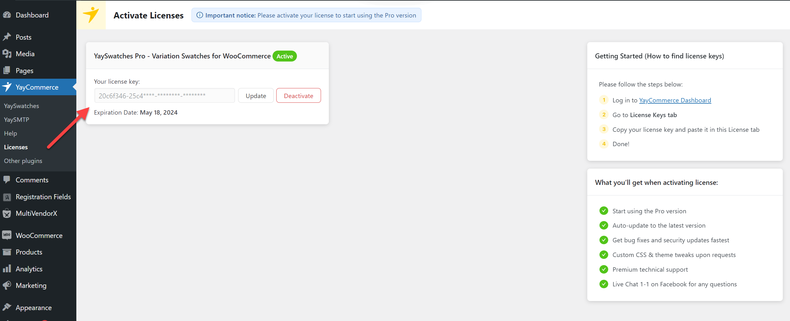 Copy the license key then paste it into your WordPress dashboard > YayCommerce > Licenses.