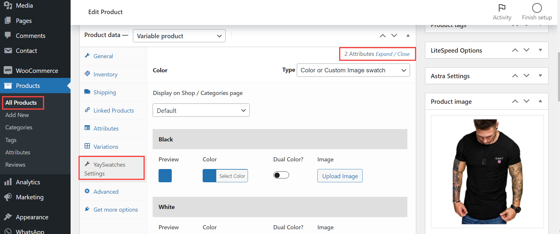 You can quickly customize swatches for a specific product when editing the product, by clicking on the **YaySwatches Settings** available at the product editing interface.